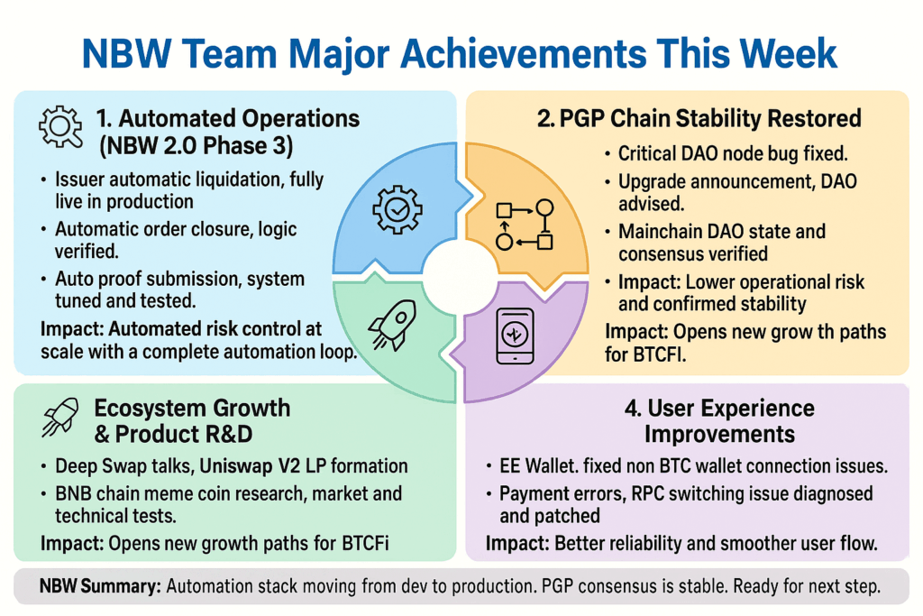 NBW’s automation stack is now moving from development → production, marking a major milestone in NBW 2.0. With liquidation, proof-submission, and unlock systems automated — and with PGP consensus stabilized — NBW is ready for the next scaling phase. Ongoing ecosystem exploration (Swap, LPs, BNB Meme coins) opens new growth vectors for the wider BTCFi ecosystem.