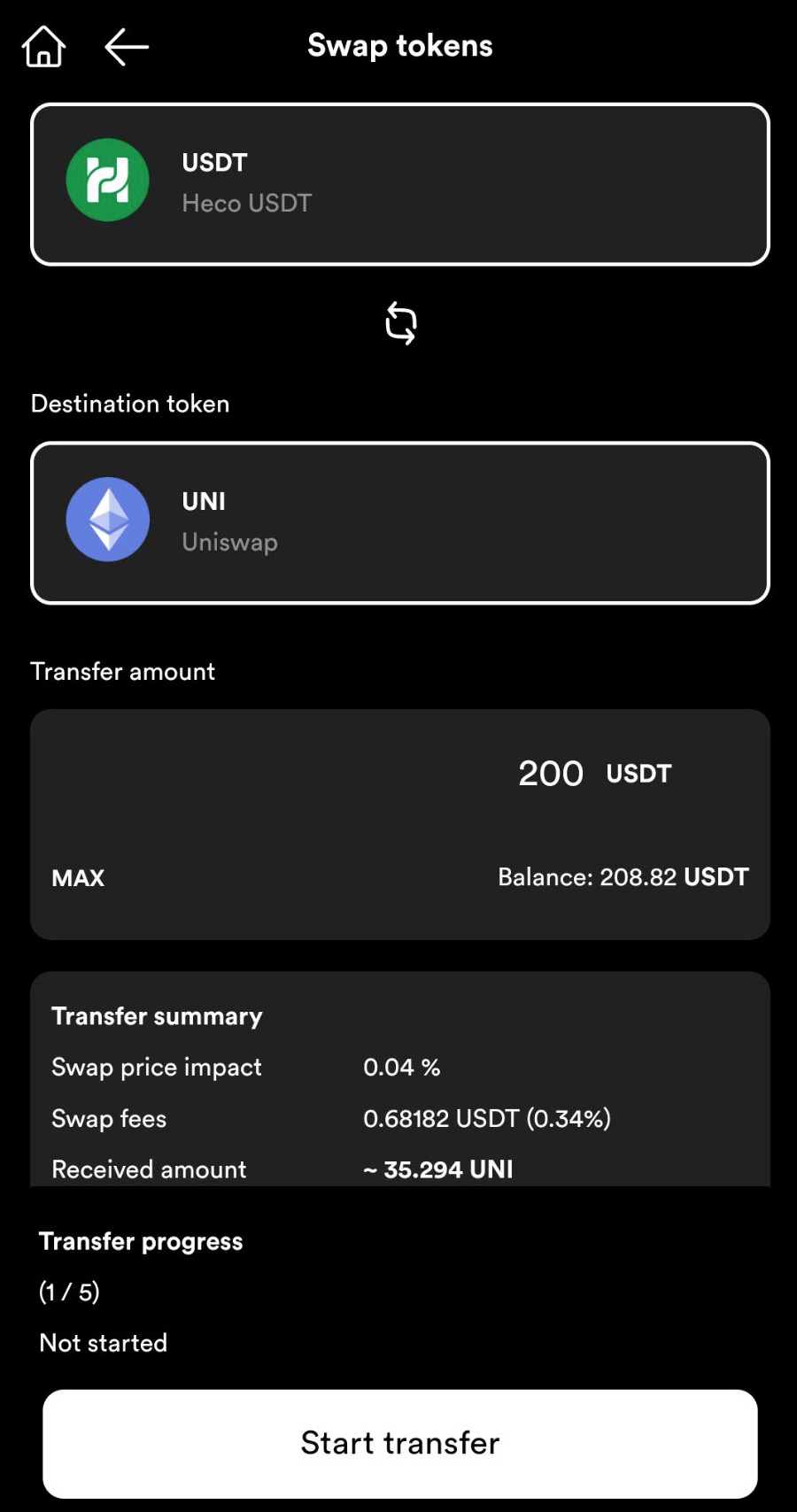 • Via the cross-chain swap widget, users may select tokens directly on the Essentials home screen to begin a cross chain swap.